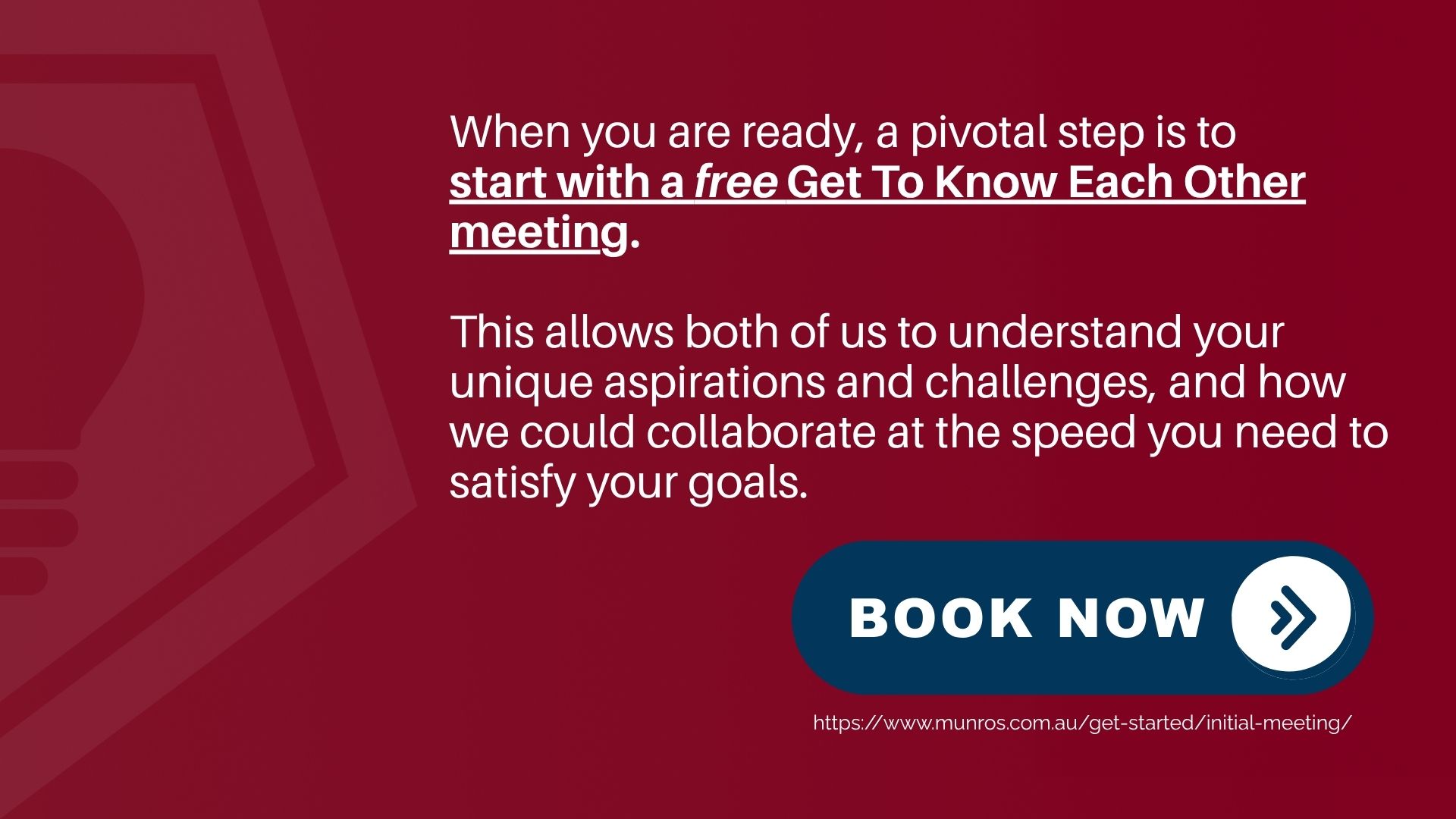 Let’s find out by having an initial meeting and get to know each other. In our free Get To Know Each Other meeting we will find out about your business, goals and challenges. We can explore how we could customise accounting and business advisory services to add value. If we’re both subsequently in agreement that we want to work together, then we’ll arrange an engagement agreement and once signed we’ll be jointly working together on the chosen business advisory solutions.